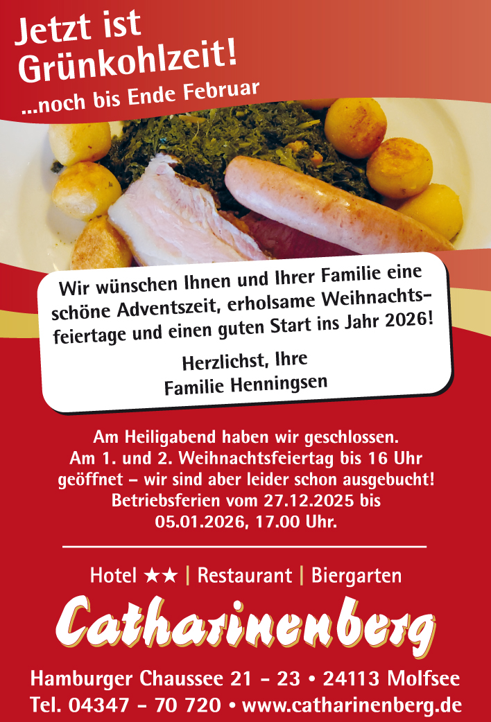 Die gutbürgerliche Holsteiner Küche setzt auf Frische sowie regionale und saisonale Gerichte. Die Spezialität des Hauses sind auf regionale Art fangfrisch zubereitete Fischdelikatessen aus Fisch der nahen Umgebung. Das für Schleswig-Holstein typische „Sattessen“ hat im „Catharinenberg“ Tradition. Hierzu gehören der „Hering“ und „Holsteiner Grünkohl“.
